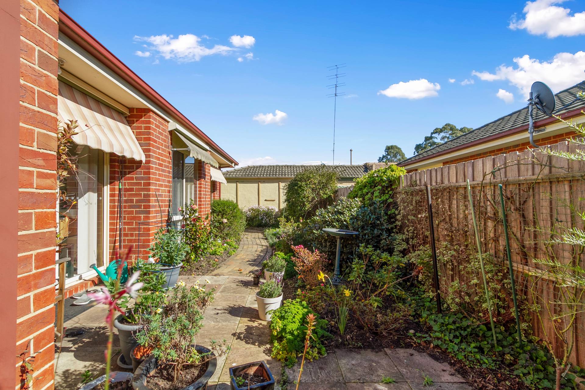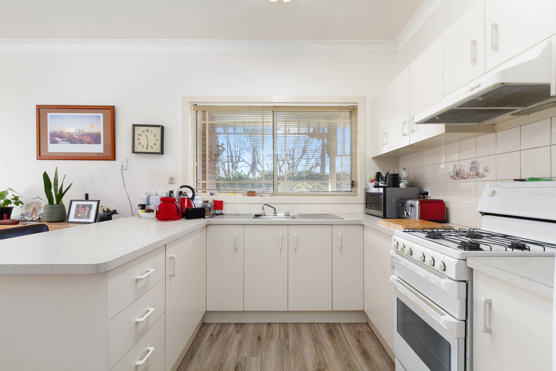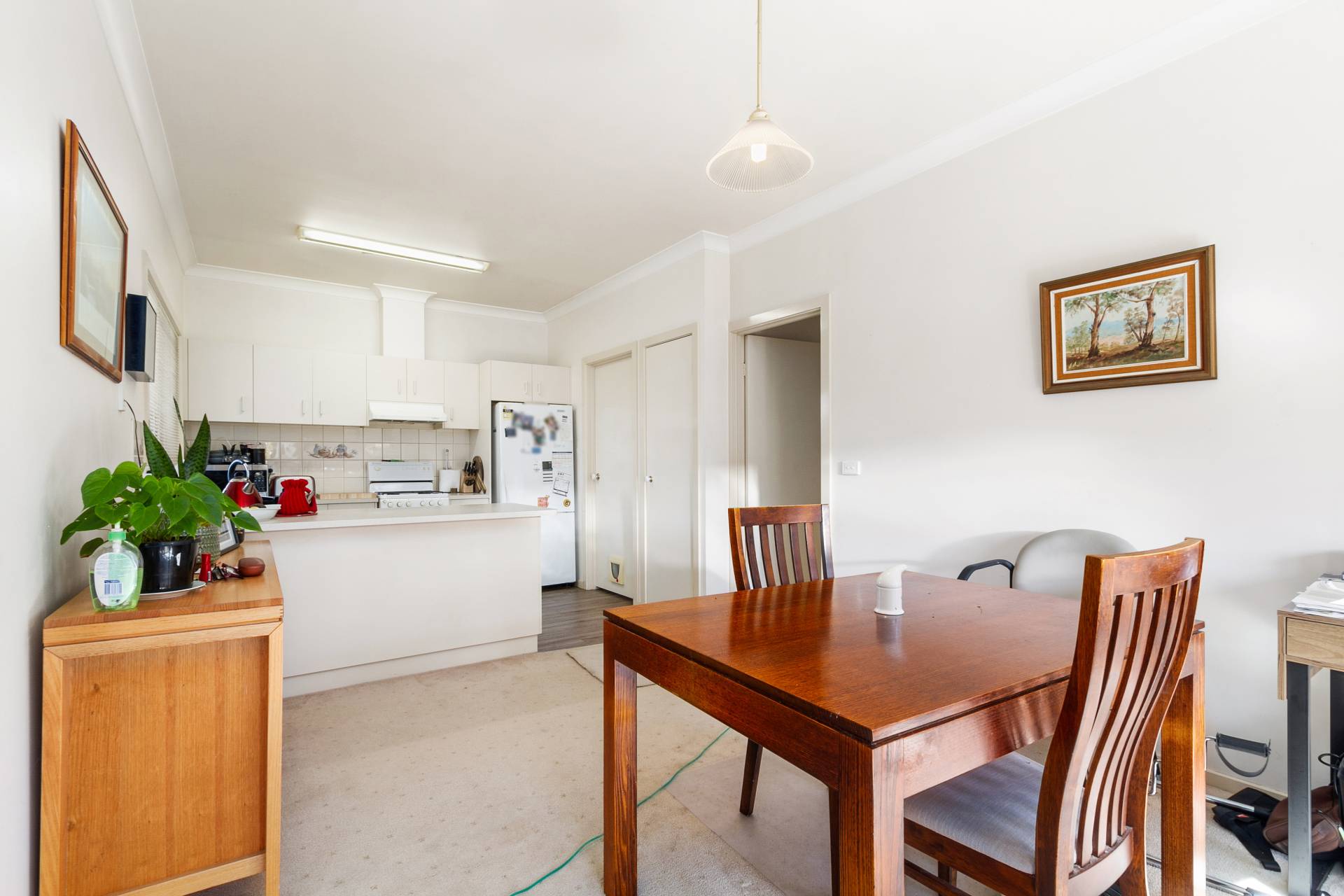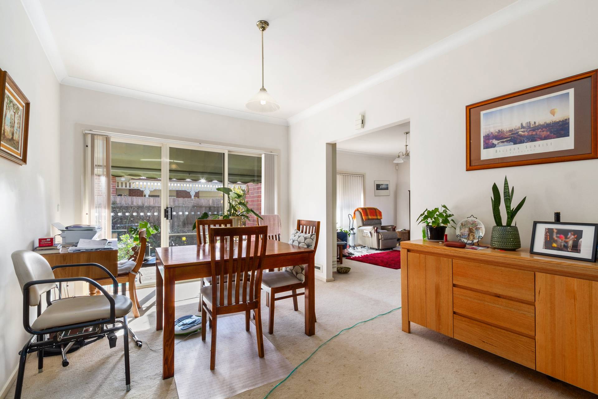 * Open kitchen/dining with north facing sliding door to small low maintenance garden with shed