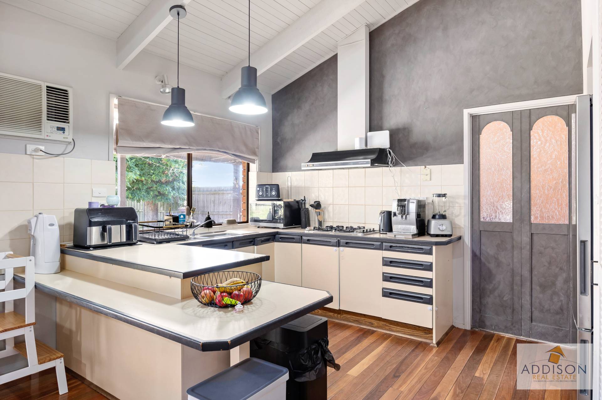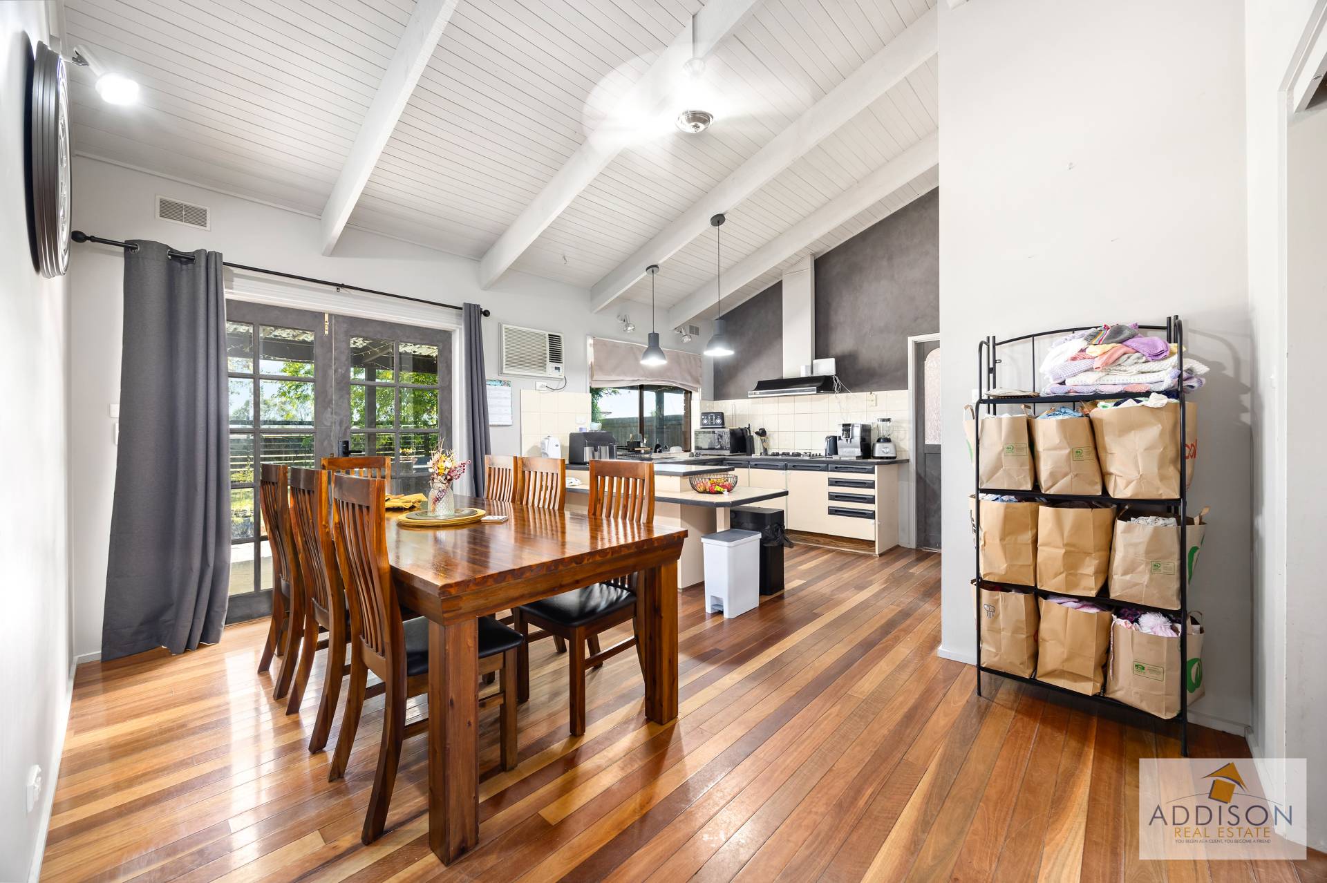 Family size brick beneer home featuring a large L-Shaped lounge/dining with reverse cycle air conditioner plus gas log fire